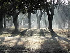 <朝>2日2晩雨が降り続いた翌朝です。日差しが増すと共に、地からも樹木からも、一斉に蒸気がたちのぼり、やわらかな光に包まれました。普段は特に心を惹かれることもなく通り過ぎてしまう、公園の片隅の木立ちが、この朝は全く違って見えました。( 2005年1月撮影 )