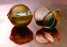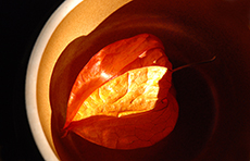 <ほおずき>「これどうやって撮ったの?」とよく聞かれます。何も考えずにひょっこり撮った1枚です。鑑賞用のほおずきの1個を器に入れてテーブルに置いてあったのですが、窓を開けた時、そこに斜光がぱっと当たって、きりりと面白い輪郭線が出ました。ちなみに、器は「横川の釜飯」のお釜です。( 2010年8月撮影 ) ![]()