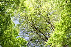 <あこがれ>私たちが新緑の逆光に惹かれるのは何故でしょう?順光の時は光の当たった部分がぎらぎらして、影がくっきりと暗く見えます。これに対して逆光の場合は、そのような暗さがなく、モノ全体の内部から優しい光があふれているように見えます。私たちがいつも見ている光と影のありさまとは次元の違った「光」の別世界を垣間見るような気がします。一種の懐しさを伴う光景です。空に向けてファインダーをのぞいたこの時、自分が今撮ろうとしているものは枝でも葉でもなく、心の中の憧れなのだと気づきました。( 2017年4月撮影 ) ![]()