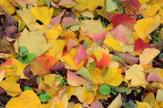 <彩り>紅葉シーズンなのに仕事がたて込んで撮影に行けない。それでもきれいな葉っぱをどうしても見たくなり、30分だけ、とカメラを持って飛び出しました。自宅から歩数分の空き地に色とりどりの落葉が散り敷いているのに出会いました。折しも雨の合間、地上はきれいに洗われて薄化粧を施したようでした。葉っぱの裏と表につく水滴の表情が違うのも、面白いです。