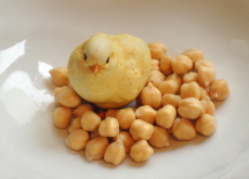 <ひよことヒヨコマメ>水にふやかしたヒヨコマメは色も形もひよこそっくりです。ぷっくりふとったひよこの置物は彫り物でmade in Italy。彫り手の愛情を感じます。実際のひよこは意外にも鋭い顔つきをしているので、置物のほうがかわいい表情です。