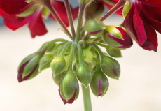 <つぼみ>お花がいっぱいの近所のお庭。散歩の足を止めて見とれていたら、庭で手入れをしておられた女主人が花を分けてくださいました。節くれだったゼラニウムの大きな老株から奔放に伸びた花枝は、切り取られた後も大地の滋養をたくましく受け継いでいるようでした。つぼみはぴちぴちふとっていて、園芸店に並んでいる鉢植えのゼラニウムにはない勢いを感じました。(2020年5月撮影)