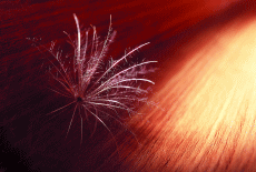 <羽毛>ダウンコートの縫い目からこぼれ落ちた羽毛ひとひら。拾い上げ見とれるうちに捨てられなくなり、しばらく戸棚にしまっておきました。早春のよく晴れた午後、ブルーのガラス器にそっと入れて、そっと撮影しました。羽毛は息がかかっただけでふんわりと動いてしまいますから。 (2018年2月撮影)