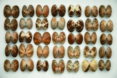 <アサリ貝殻>味噌汁の鍋を洗って貝殻をざるに掬い、捨てようとしたその瞬間、あ、きれい、違った模様だ、と気づいて、 慌てて拾い直しました。夏期休暇中だったので、時間はたっぷり。曇天窓辺の柔らかな光のもとに並べて三脚 を立て、ゆっくり撮影しました。自然界では砂に潜って棲息しているはずのこの貝にこんなに変化に富んだ模様がある なんて、神様の創造の業は不思議です。( 2008年8月撮影 )
