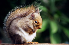 <ニホンリス>井の頭公園リス園にて。寒い日のアサイチです。膨らませたしっぽが天然コートになっています。このように「かたまって」くれると、中望遠レンズで何とかブレずに撮影できます。かわいいポーズはお祈りしているように見えます。黒目に冬空と樹々が映っています。( 2001年2月撮影 )