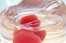 <ゼリー一匙>さくらんぼの透明なゼリーです。一匙掬ったら、打ち寄せる波のような流れができました。面白い、と思ってカメラを取り出しました。想定外のシャッターチャンスでした。まさか食べかけのゼリーが被写体になろうとは。 (2017年7月撮影)