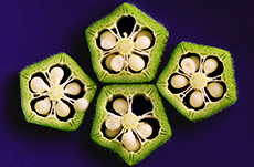 <オクラ>大きめのオクラ、カットした切り口がみごとな梅文様。自然には美しい秩序があふれています。 (2004年8月撮影)
