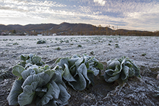 <キャベツ畑>小海線沿線、JR最高地点の碑が立つ野辺山高原は、11月初旬にして早朝は凍りつくような氷点下でした。手足がしびれる寒さの中を足早に歩くと、冬ざれたキャベツ畑に出会いました。ぽつぽつ残ったキャベツが霜化粧。いちめん、白いぎざぎざにおおわれて細工物のようです。1時間ほどしてお日様が出ると、霜は融けて、ふつうのキャベツ畑に戻ってしまいました。(2018年11月撮影)。